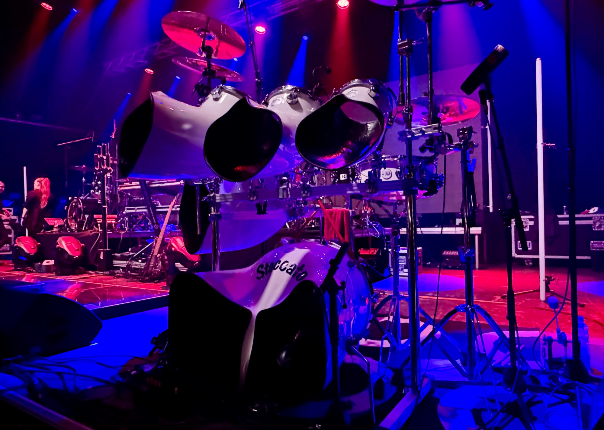 Nachdem ich Ende der 80er mit einem schönen, aber abgerockten 50er-Jahre Trixon-Luxus in Blue-Sparkle die ersten Bandversuche gestartet hatte, verfolgte mich eine Erinnerung an 70er-Jahre-Musikladen-Sendungen. Merkwürde Fisheye-Kamerafahrten in trichterartige Kessel. Schließlich entdeckte ich North aus den USA. Nach einiger Recherche fand ich ein Foto von einem noch skurrilerem Kit: Staccato!